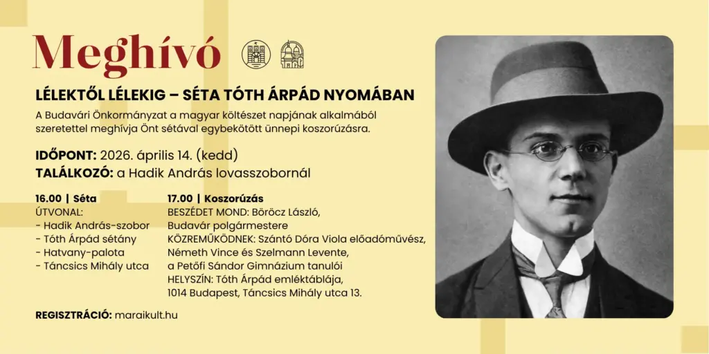 A Budavári Önkormányzat a magyar költészet napja alkalmából sétával egybekötött ünnepi koszorúzást szervez Tóth Árpád születésének 140. évfordulója tiszteletére.