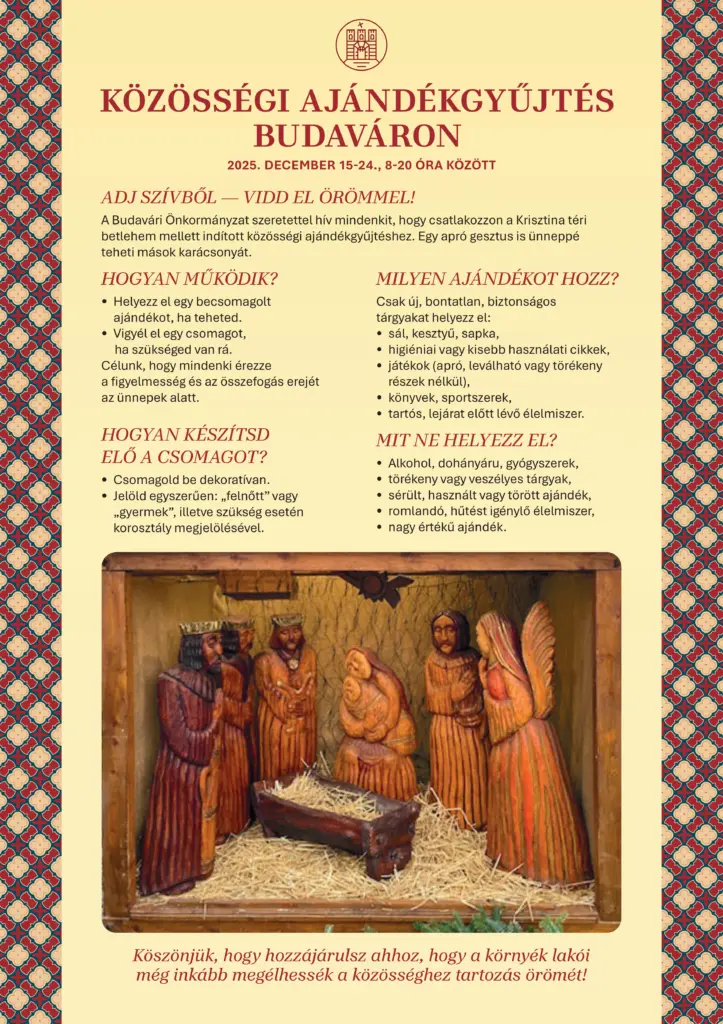 A Budavári Önkormányzat szeretettel hív mindenkit, hogy csatlakozzon a Krisztina téri betlehem mellett indított közösségi ajándékgyűjtéshez december 15-24 között. Tegyük együtt szebbé a karácsonyt!